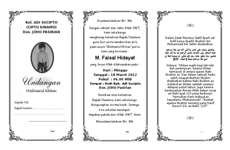 khitan secara bahasa artinya memotong. Waktu khitan ada perbedaan pendapat tentang kapan waktu disyariatkannya khitan. Sebagian 'ulama memahami bahwa khitan itu khusus untuk lakilaki, sedangkan untuk wanita tidak ada hadits yang shahih dan sharih (secara tegas) yang menyuruh wanita untuk berkhitan. Sesungguhnya allah telah memilih agama ini bagimu, maka janganlah kamu mati kecuali dalam memeluk agama islam". Download now contoh surat undangan walimatul khitan yang sering.