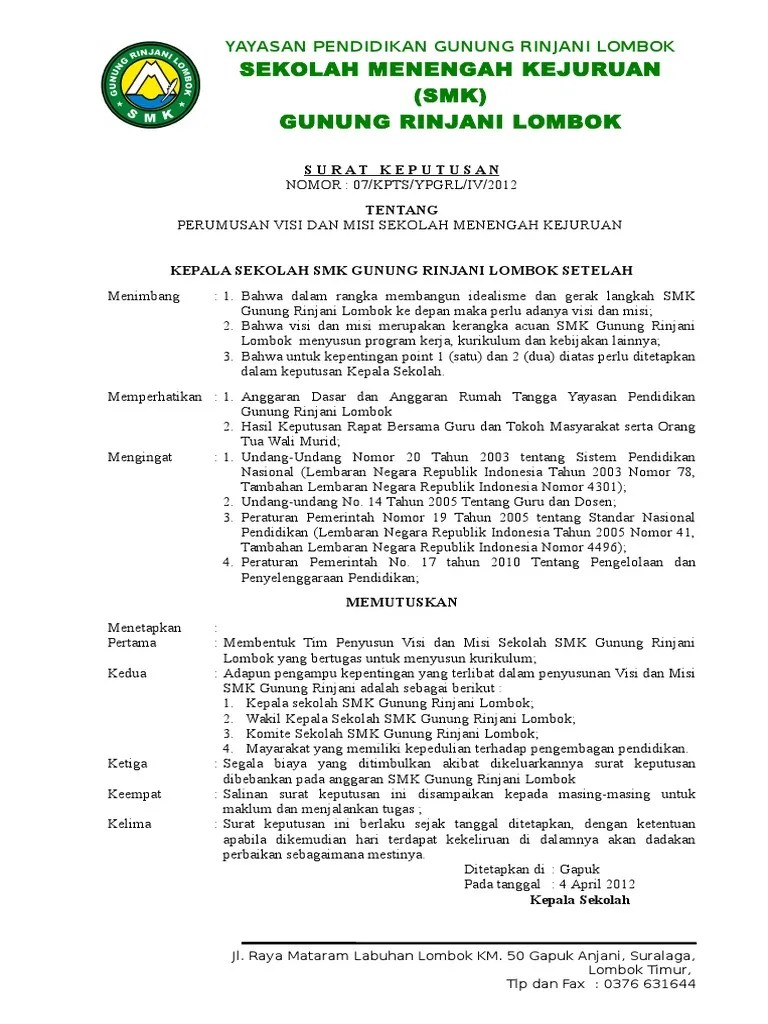 Madrasah aliyah negeri 1 samarinda plus keterampilan. Contoh sk kepala sekolah/madrasah dan penyusunan visi misi. Keputusan kepala sekolah menengah atas negeri 1 warungkiara kabupaten sukabumi nomor : Proses penyusunan visi universitas lambung mangkurat (ulm) dilandasi oleh naskah akademik, yang telah disahkan berdasarkan sk rektor nomor 263/un8/kp/2015. 085640681630 surat keputusan kepala sekolah nomor :